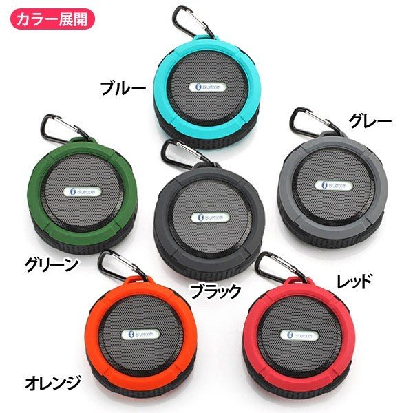 付属品 ケーブル 約45cm (USB→microUSB)/カラビナ/吸盤 【仕様】 ●入力電圧:DC5V/600mA ●出力電力:5W ●接続方式:Bluetooth3.0 ●リチウムイオン電池:3.7V/500mAh ●スピーカーユニット:4オーム/5W ●周波数特性:120Hz-22kHz ●S/N:> 90db ●本体重量:145g ●サイズ:W87mm×D35mm×H95mm ●稼働時間:3?4.5時間 (フル充電3時間) ●スタンバイ(待機)時間:2週間 ●カラー:ブラック/グレー/レッド/ブルー/オレンジ/グリーン
