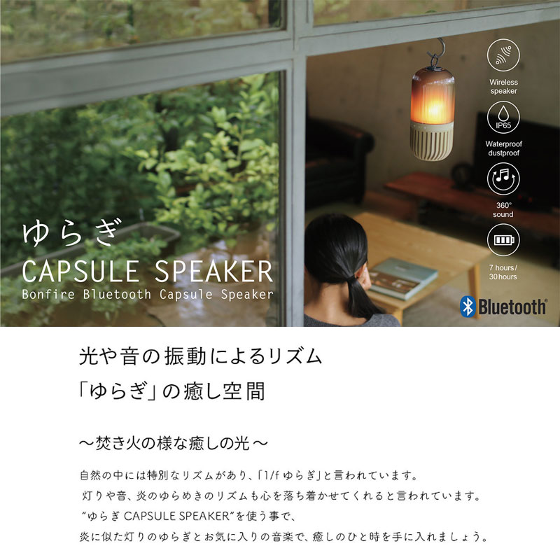 リビングに吊るしたり、家族や仲間との時間に、一人の瞑想時間に、バスタイムに、寝室で、アウトドアにと様々なシーンでご使用いただけます 電源DC5V 600mA(USB充電式) 接続Bluetooth5.0 最大通信距離約10m(周辺環境により変わる場合があります) 充電池(内蔵)リチウムイオン蓄電池 充電時間約4時間 連続使用時間約7時間(ライト、スピーカー同時使用) 約30時間(ライトのみ使用) 主な仕様・焚火のような動きのある灯りと固定の灯りと2種類の灯りを楽しめます ・360°全方向に広がるスピーカーなので場所を問わず楽しめます ・防塵防水仕様なのでバスルームや水辺、屋外でも安心してご使用いただけます(IP65対応) ・充電式ワイヤレスでどこでも持ち運べます ・Bluetoothを搭載した機器と簡単に接続可能 ・リングは2本の指を入れて掴みやすい形状。