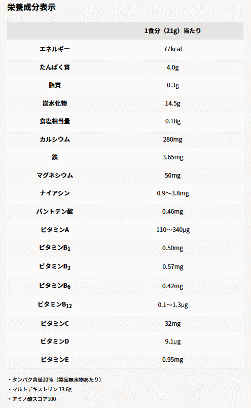 ・原材料名 デキストリン(国内製造)、乳清たんぱく、食塩/炭酸Ca、炭酸Mg、増粘剤(プルラン)、 香料、V.C、甘味料(アスパルテーム・L-フェニルアラニン化合物、アセスルファムK)、 ピロリン酸第二鉄、V.E、V.B2、V.B6、パントテン酸Ca、V.B1、ナイアシン、 V.A、V.D、V.B12、(一部に乳成分・大豆を含む) ・賞味期限:18ヶ月 ・おすすめの摂取ポイント 朝食時・運動後・間食事・おやすみ前 ※当店とメーカーの在庫を合わせた数を表示しておりますので、 稀に欠品する場合もございます。