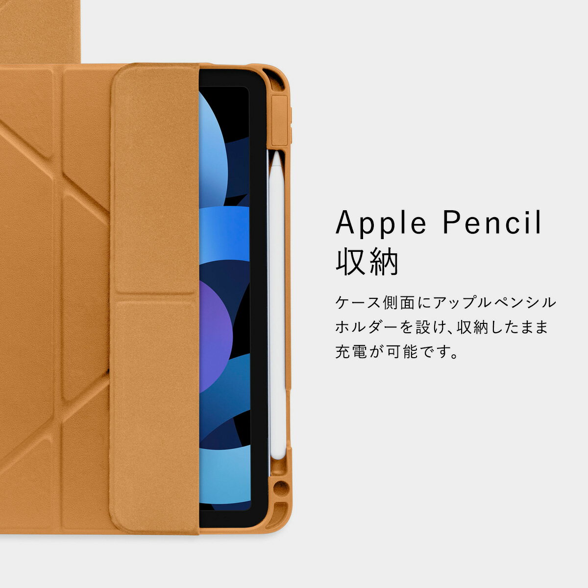 【製品仕様】… ◆ 対応機種 : Apple iPad Air 4 10.9インチ 第4世代 2020年モデル ( アップル アイパッド エアー 4 10.9 第四世代 ) / iPadPro 11 インチ 第2世代 2020年モデル ( アイパッド プロ 11インチ 第二世代 ) / iPadPro11 インチ 第1世代 2018年モデル ( アイパッドプロ11 インチ 第一世代 ) ◆ 内容物 : ケース × 1個 ◆ サイズ : 約 25.3cm × 19.5cm × 1.4cm ◆ 重量 : 約 310g ◆ 素材 : PUレザー(合成皮革)、TPU【製品特徴】… ◆ オートスリープ 機能 : 対応 ◆ Apple Pencil ホルダー : あり ◆ Apple Pencil 2nd 充電 : 対応 ◆ Magic Keyboard : 非対応 ◆ Smart Keyboard : 非対応 ◆ Smart Cover : 非対応 ◆ スタンド機能 : あり ◆ 側面保護 : 全側面保護【Apple Pencil 収納】… ケース側面にアップルペンシルホルダーを設け、収納したまま充電が可能です。