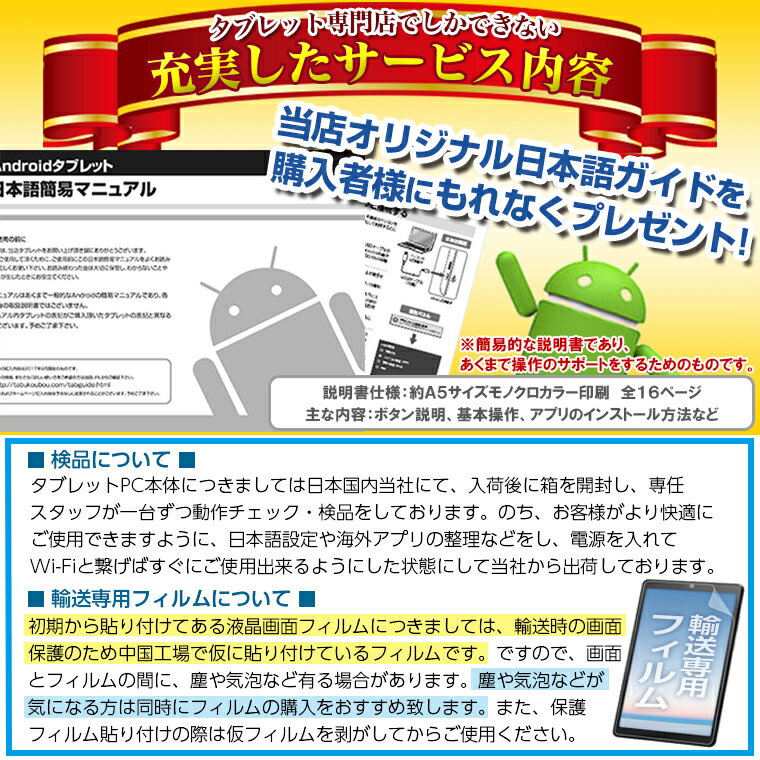 Gセンサー 4辺回転 I/Oポート Type-Cポート、microSDスロット Micro SDカードスロット※片方のSIMスロットと共用、NanoSIMカードスロット、内蔵スピーカー、 マイク SIMサイズ NanoSIM 対応バンド FDD-LTE:B1,B2,B3,B5,B7,B8,B17,B20TD-LTE:B38,B39,B40,B41WCDMA:B1,B2,B5,B8GSM:B2,B3,B5,B8TDCMA:B34,B39 バッテリー 6000mAh 本体サイズ 約241×159×9.2mm 本体重量 約520g 材質 金属 ソフトウェア ファームウェア Android10.0 言語 日本語含めマルチ言語 付属品 USBケーブル Type-Cケーブル1本 保証について ●原産国は中国となります。
