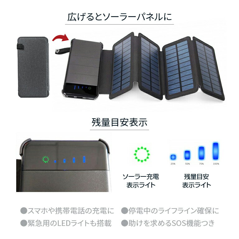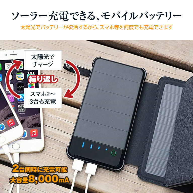 商品説明ソーラー充電できる、モバイルバッテリー太陽光でバッテリーが復活するから、スマホ等を何度でも充電できます スマホや携帯電話などのバッテリーが切れても、モバイルバッテリーがあれば安心。