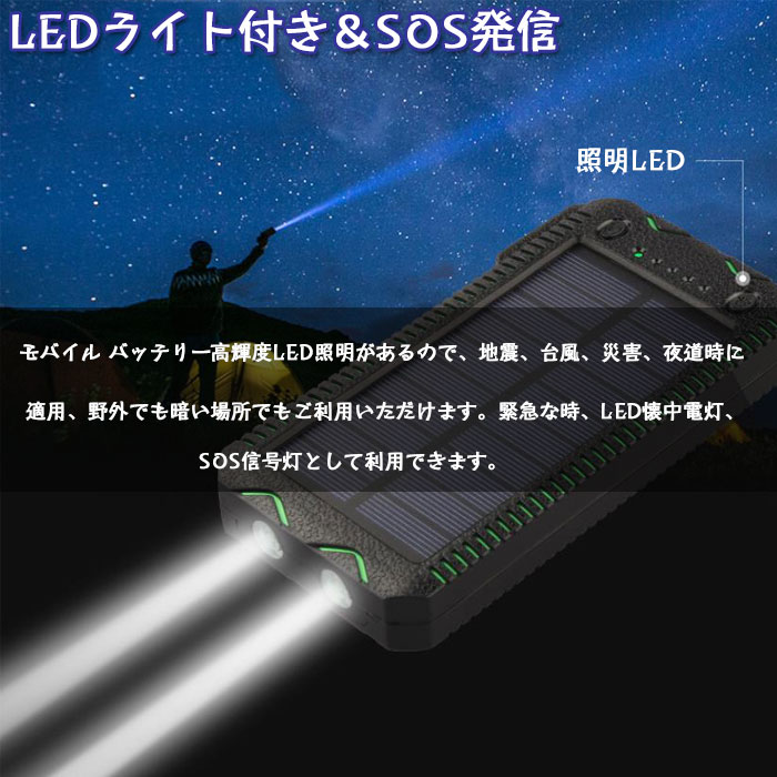 "【LEDライト付き&SOS発信】 モバイル バッテリー高輝度LED照明 があるので、地震、台風、災害、夜 道時に適用、野外でも暗い場所でも ご利用いただけます。