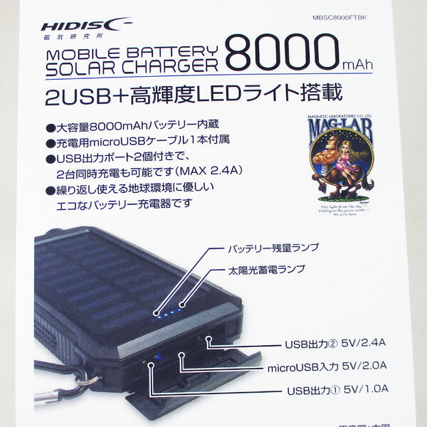 モバイルバッテリー ソーラーパネル 2USB+高輝度LEDライト搭載 8000mAh MBSC8000FTBK HIDISC 4984279641163 商品詳細 大容量8000mah ソーラーチャージャー充電機能 充電用microUSBケーブル付属 USB出力ポート2個付き2台同時充電の可能(MAX2.4A) 非常時に大活躍!緊急用ライト搭載 3つの機能 ハイビーム ロービーム SOS発信光 スイッチ2回押しで点灯 1回押しで機能切り替え 2回押しで消灯 本体コンパス(方位磁石) カラビナフック付き 型番 MBSC8000FTBK JANコード 4984279641163 容量 8000mAH 規格 リチウムイオンポリマー 重量 約248g サイズ 140×77.6×24mm 備考 入力:DC5.0V 2.\A 出力:最大2.4A(合計出力) ソーラーパネル: DC5V/0.3A(MAX) 充電時間: 約5時間 保護回路: 過充電, 過放電 保証 6ヶ月 発売元 磁気研究所 注意事項 サイズの問題でこちらは緩衝材に入れずに そのまま袋 に入れて 発送となりますので破損等の可能性もございま すの でご了承のうえご購入ください。