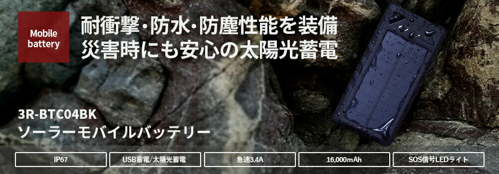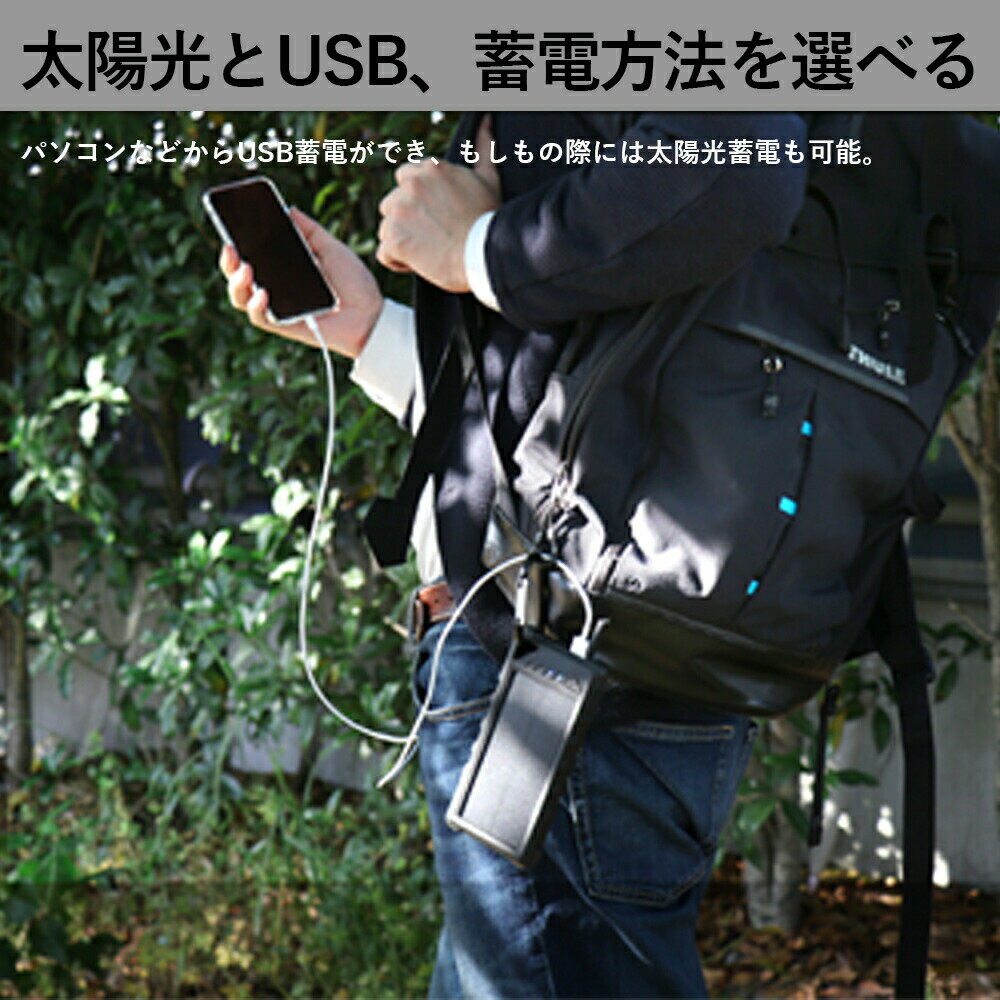 ■太陽光蓄電なら災害時にも安心・太陽光とUSB、2つの蓄電方法から選べる・非常時の備えに、SOS信号が出せるLEDライト■過酷な環境も耐え抜く、耐衝撃・防水・防塵機性能・高さ2mからの落下実験に耐えるタフなモバイルバッテリー・世界基準のIP67の防水防塵性能を兼ね備えた高スペックなソーラーモバイルバッテリー。