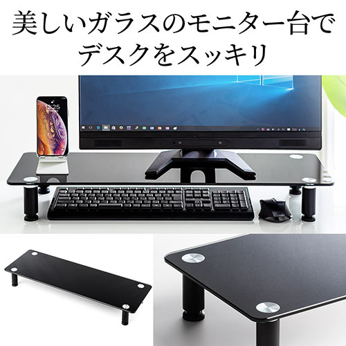 ノートパソコンやで電話台としても使用可能な黒色のガラス天板のモニター台。