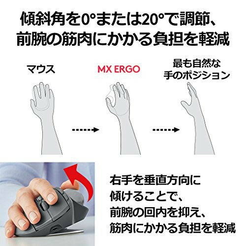 MX ERGOサイズ:高さ132.5 x 幅51.4 x 奥行き99.8(mm) Unifyingレシーバーサイズ:高さ 18.4x 幅14.4 x 奥行き6.1(mm) MX ERGO重量: 164g(メタルプレート/レシーバーなし)/重量: 259g(メタルプレートあり/レシーバーなし) Unifyingレシーバー重量: 2g Unifyingレシーバー:必須:USBポートWindows 10以降、Windows 8、Windows 7、macOS X 10.12以降 Bluetooth:必須:Bluetooth low energy、Windows 8以降、macOS X 10.12以降 1回のフル充電で最長4ヵ月、1分の充電で約1日使用可能な高速充電。