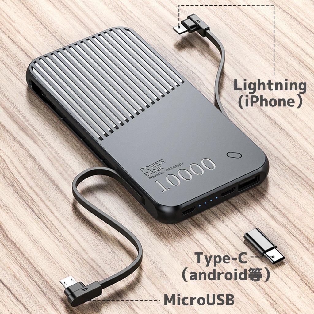 ・フル蓄電時間:約5-7時間・充電回数:iPhoneSE 5回程度充電可能・10000mAhで1つの出力USBコネクターを搭載したモバイルバッテリー・経済産業省検査基準J62133(H28)テスト済みPSEマーク付き・Lightningケーブル、Type-Cケーブル、MicroUSBケーブル内蔵でケーブルを忘れることなく充電が可能です。