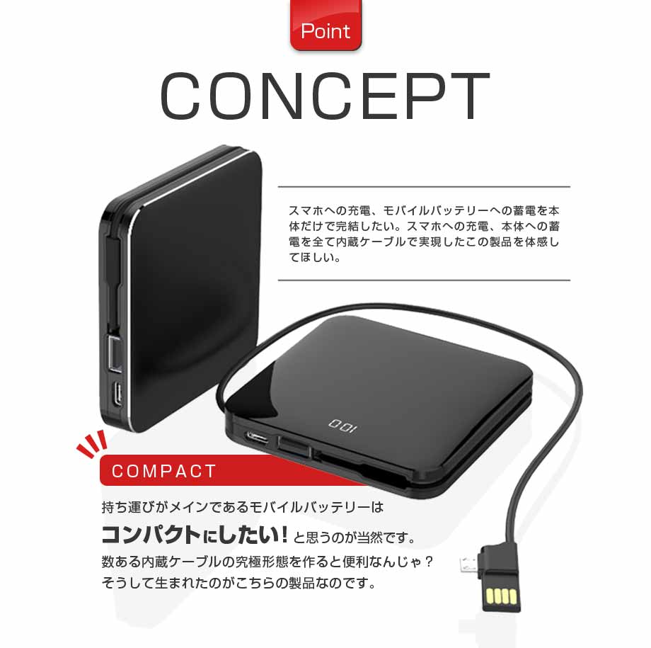 ) USBケーブル内蔵モバイルバッテリーの特徴 ・とってもコンパクト(軽量/小型)なので軽い/薄い/すっきり収納でき、持ち運びにも適した充電器 ・大容量10000mAh(目安:iPhone6 4回充電)なのに薄型で飛行機などの機内への持ち込みもOKです。