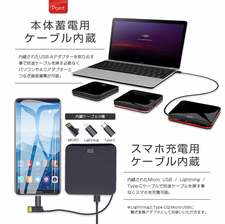 更に、USB-Aケーブルが内蔵されている為、モバイルバッテリーの残量が無くなりそうな時でも モバイルバッテリーの内蔵ケーブルをACアダプターやパソコンに挿す事で本体の蓄電が可能。