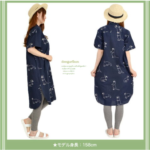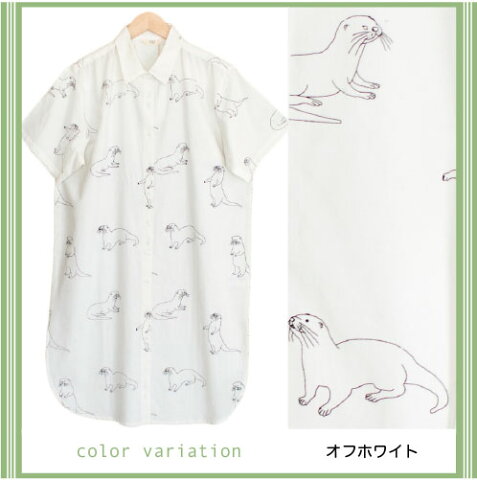 品番f15-15品名半袖コットンシャツワンピース モノトーンイラストのカワウソ柄♪