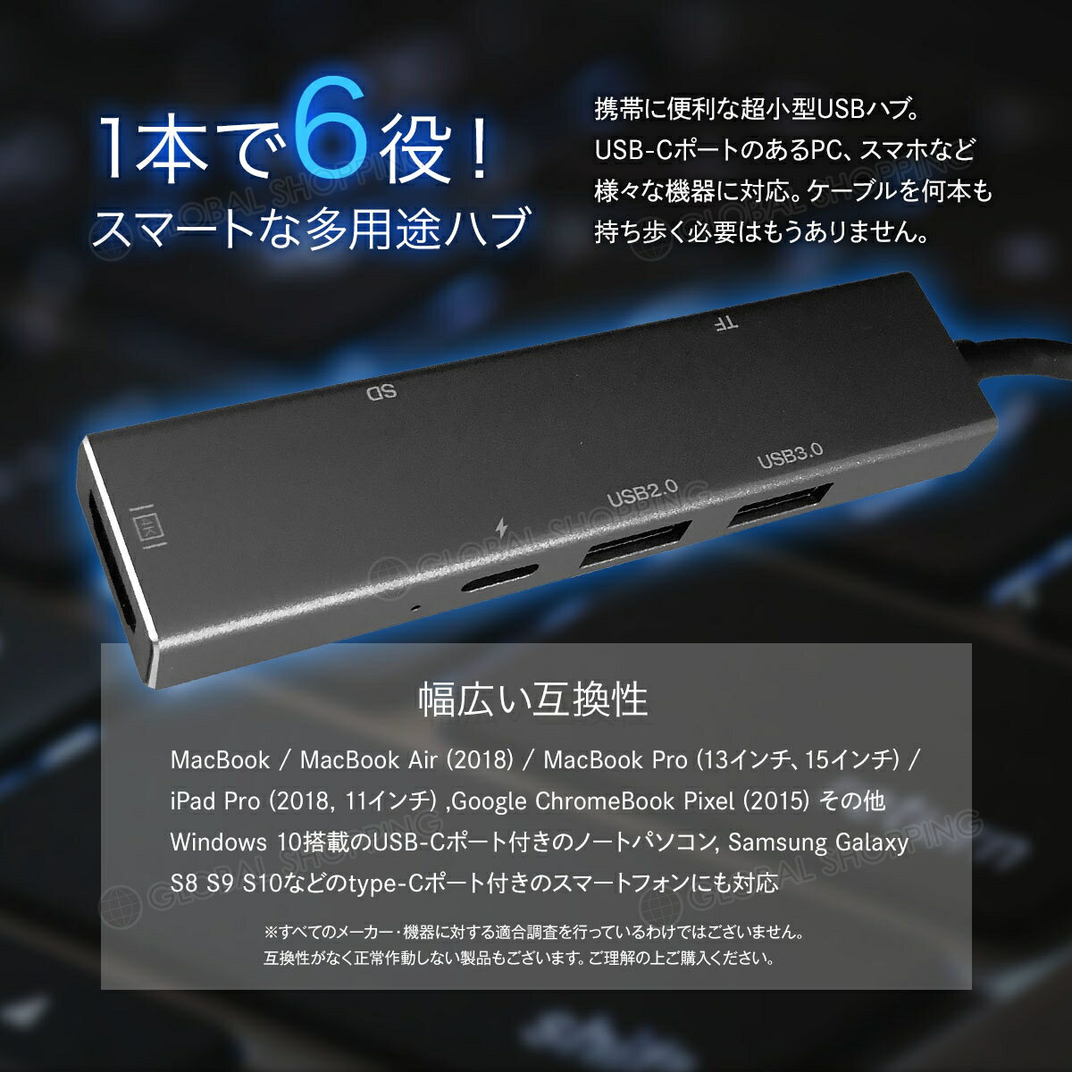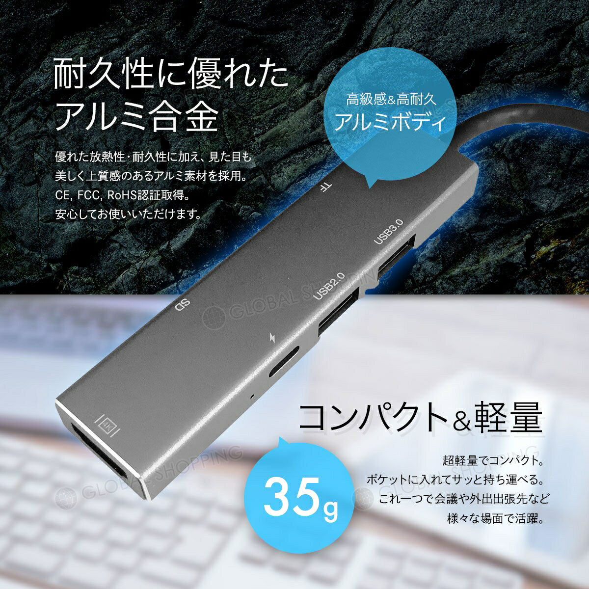 6in1変換マルチポートアダプタ ● PD充電ポート×1 ● 4K HDMIポート×1 ● Micro SD/ TFカードリーダー ×1(最大512GBまで) ● SDカードリーダー×1 ● USB 3.0ポート×1 ● USB 2.0ポート×1 【製品仕様】 USB3.0データ転送速度:最大5Gbps(理論値) 材質:アルミ合金 CNCカバー 本体寸法:縦99mm/幅23mm/厚10mm ケーブル長:105mm 重量:約35g HDMI解像度:2K/1080P/3840×2160@60Hz/4K@30Hz PD高速充電:60W(最大) 【USB-C電源供給ポートPD60W】 USB Type-CをHDMI/TYPE-C充電ポート/ TFカード/SDカード/USBインターフェイスの各種端子に変換。